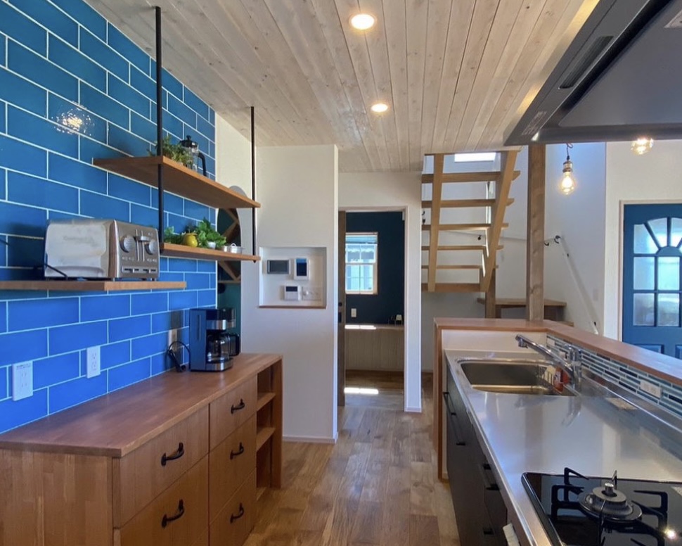 爽やかなブルーのクロスとタイルに素敵に馴染んでいます。